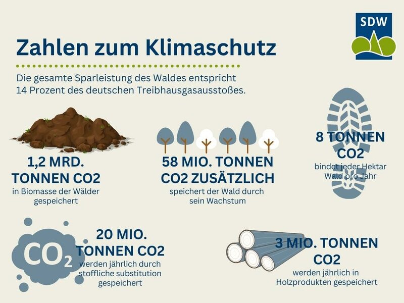 Wälder speichern sehr große Mengen Kohlenstoff, da sie bei der Fotosynthese Kohlendioxid (CO2) aufnehmen, Holz bilden und somit das Klima unserer Erde stabilisieren. Sie geben das CO2 erst wieder in die Atmosphäre ab, wenn das Holz verrottet oder verbrannt wird. Allein in den Wäldern Deutschlands sind etwa 2,5 Milliarden Tonnen CO2 gespeichert, mehr als die Hälfte davon im Waldboden. In der Debatte um den Klimawandel sind Wälder neben den Ozeanen die wichtigste Kohlenstoffsenke auf der Landfläche.